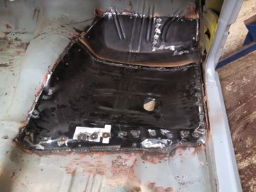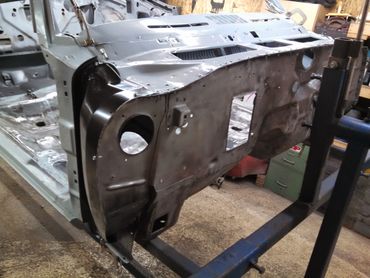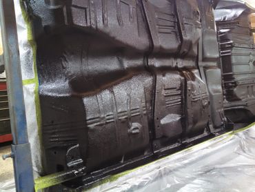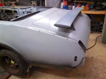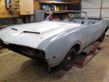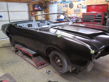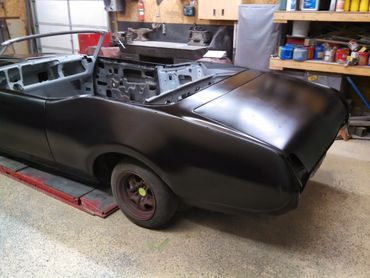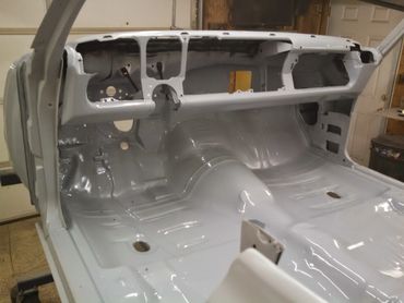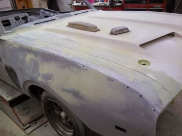 This classic had been sitting for a while and although fairly solid some of the work done by previous shops was not up to the standards of the owner. Rust repairs were completed and some custom touches like a fiberglass hood, trunk spoiler and shaved door handles were incorporated. The underside of the body was sprayed with protective bed liner. The body was left in epoxy primer until the drivetrain is installed by the owner.